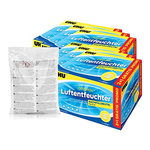 Refill. Dehumidifiers are products to regulate the air in damp or slightly ventilated spaces, such as in basements, storage rooms, interior bathrooms, old buildings, weekend or holiday homes, caravans, boats. You escape the room air by means of a highly effective granules (in bag or Tabform) the excess moisture and protect your property, since corrosion, mold, mildew and musty odors avoided werden.Sie work without energy consumption, are self-regulating and year-round use. Your splash guard makes together with the integrated level indicator and the Ausgusslasche for easy emptying particularly clean and sicher.UHU air max dehumidifier escape the indoor air excess moisture * prevent corrosion, mold, mildew and musty odors * work without energy consumption * self-adjusting * used all year round * with . splash protection and integrated level indicator * with Ausgusslasche for easy emptying * particularly clean and safe * Available in different sizes.