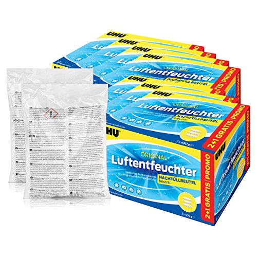 Refill. Dehumidifiers are products to regulate the air in damp or slightly ventilated spaces, such as in basements, storage rooms, interior bathrooms, old buildings, weekend or holiday homes, caravans, boats. You escape the room air by means of a highly effective granules (in bag or Tabform) the excess moisture and protect your property, since corrosion, mold, mildew and musty odors avoided werden.Sie work without energy consumption, are self-regulating and year-round use. Your splash guard makes together with the integrated level indicator and the Ausgusslasche for easy emptying particularly clean and sicher.UHU air max dehumidifier escape the indoor air excess moisture * prevent corrosion, mold, mildew and musty odors * work without energy consumption * self-adjusting * used all year round * with . splash protection and integrated level indicator * with Ausgusslasche for easy emptying * particularly clean and safe * Available in different sizes.
