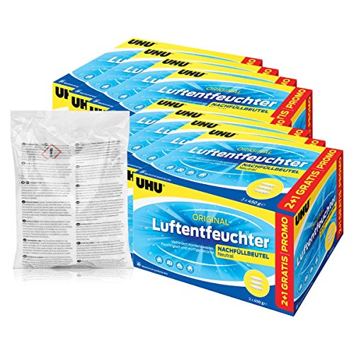 Refill. Dehumidifiers are products to regulate the air in damp or slightly ventilated spaces, such as in basements, storage rooms, interior bathrooms, old buildings, weekend or holiday homes, caravans, boats. You escape the room air by means of a highly effective granules (in bag or Tabform) the excess moisture and protect your property, since corrosion, mold, mildew and musty odors avoided werden.Sie work without energy consumption, are self-regulating and year-round use. Your splash guard makes together with the integrated level indicator and the Ausgusslasche for easy emptying particularly clean and sicher.UHU air max dehumidifier escape the indoor air excess moisture * prevent corrosion, mold, mildew and musty odors * work without energy consumption * self-adjusting * used all year round * with . splash protection and integrated level indicator * with Ausgusslasche for easy emptying * particularly clean and safe * Available in different sizes.