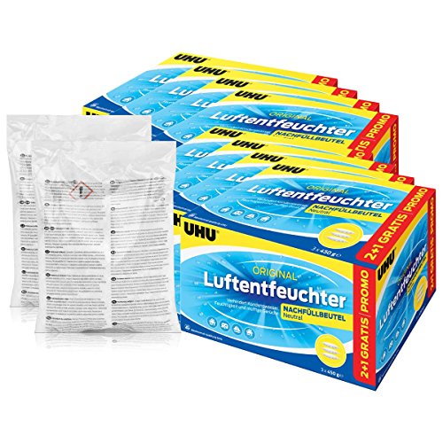Refill. Dehumidifiers are products to regulate the air in damp or slightly ventilated spaces, such as in basements, storage rooms, interior bathrooms, old buildings, weekend or holiday homes, caravans, boats. You escape the room air by means of a highly effective granules (in bag or Tabform) the excess moisture and protect your property, since corrosion, mold, mildew and musty odors avoided werden.Sie work without energy consumption, are self-regulating and year-round use. Your splash guard makes together with the integrated level indicator and the Ausgusslasche for easy emptying particularly clean and sicher.UHU air max dehumidifier escape the indoor air excess moisture * prevent corrosion, mold, mildew and musty odors * work without energy consumption * self-adjusting * used all year round * with . splash protection and integrated level indicator * with Ausgusslasche for easy emptying * particularly clean and safe * Available in different sizes.